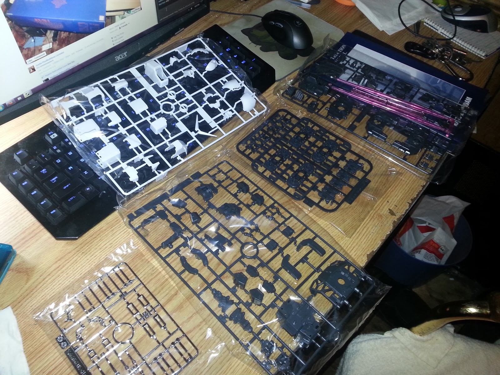 Nothing's set in stone with that yet. Just experimenting with something a little different. So weather and work aside I haven't gotten any work done with my Kshatriya besides priming all the pieces to the first leg and seperating everything by color for convenience. So for the Perfect grade, I've only finished the inner frame to one arm, I'm working on the second right now, I plan on fully constructing the inner frame before adding the outer armor, for that I think I'm going to panel line everything and add decals, then a layer of flat topcoat to eliminate the plastic-y shine from everything, and i think i'm gonna gloss or semi-gloss coat the inner frame, then stick everything together.
